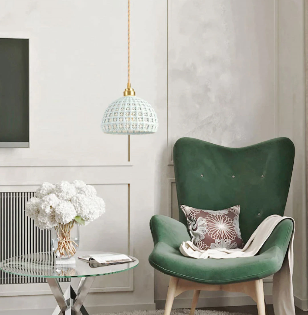 Earthen Weave" ceramic pendant light. This unique fixture embodies a harmonious blend of rustic charm and contemporary allure. Crafted meticulously from fine ceramic, its woven design intricately showcases the skillful hands behind its creation. Each gentle curve and interlaced pattern reflects the artisan's dedication, resulting in a piece that's as much an expression of art as it is a source of light.