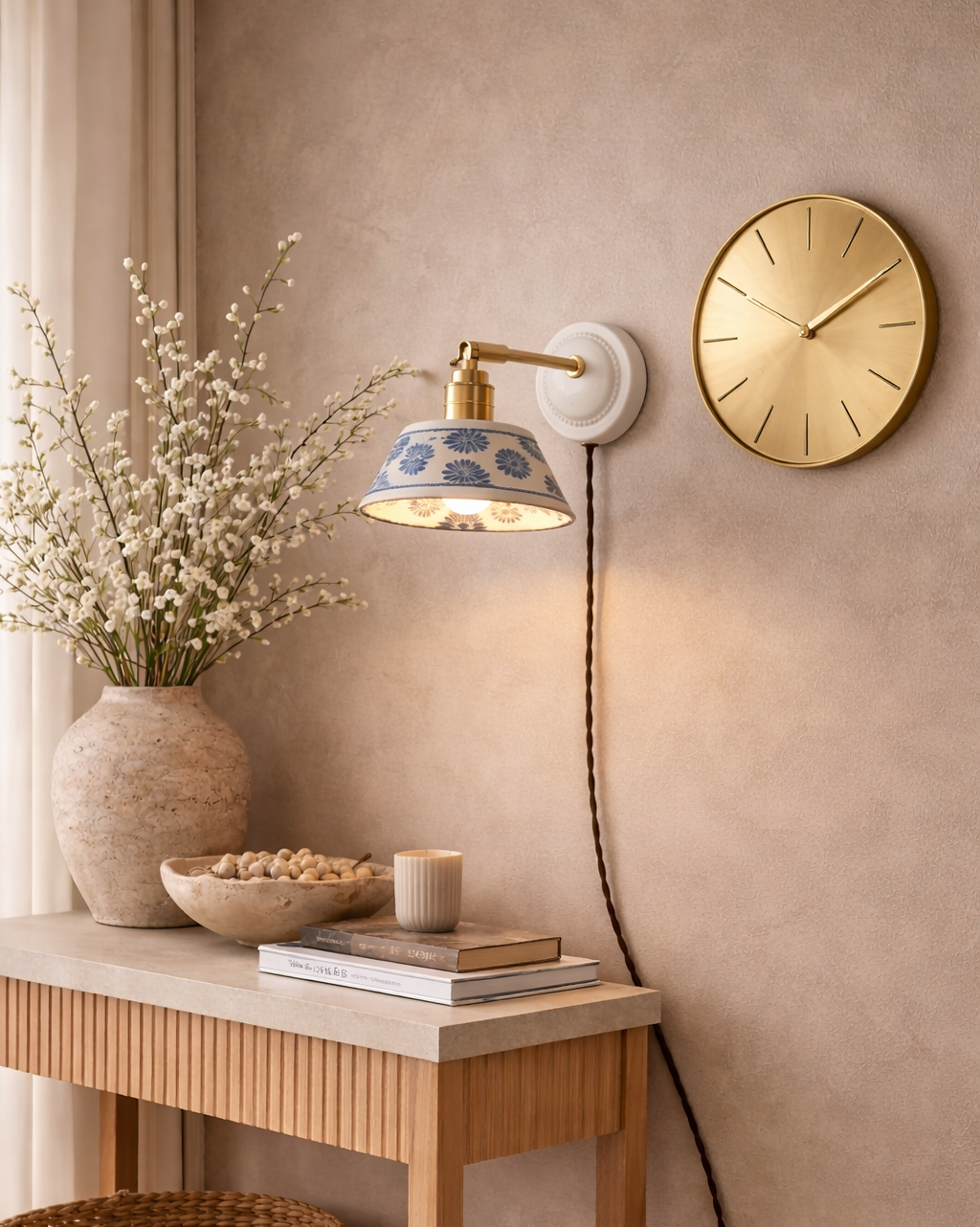 Buy This vintage Bedside white ceramic wall lamp features delicate blue painted details for a classic, handcrafted look. The sturdy brass fitting and white wall mount make it a reliable and stylish addition to any room. Its soft, warm light creates a cozy atmosphere, perfect for bedrooms, hallways, or reading corners.